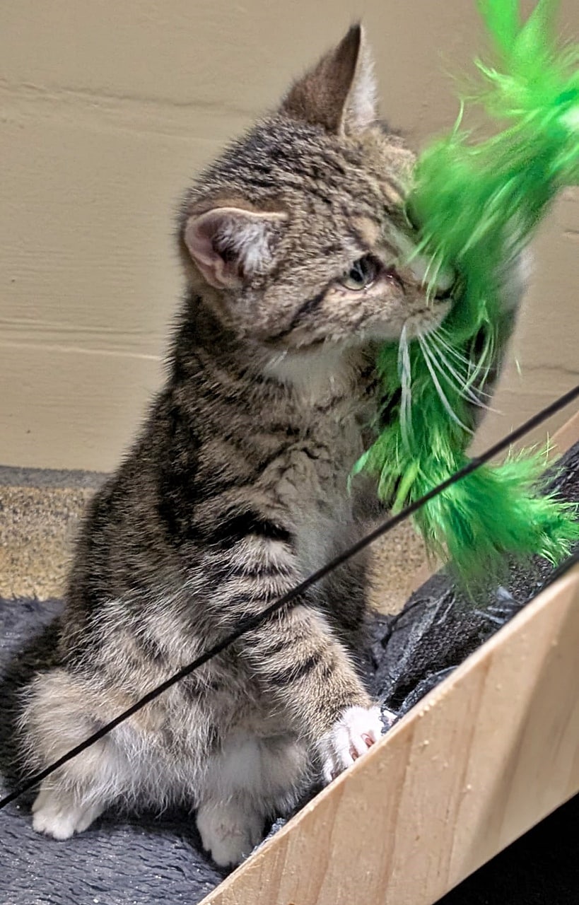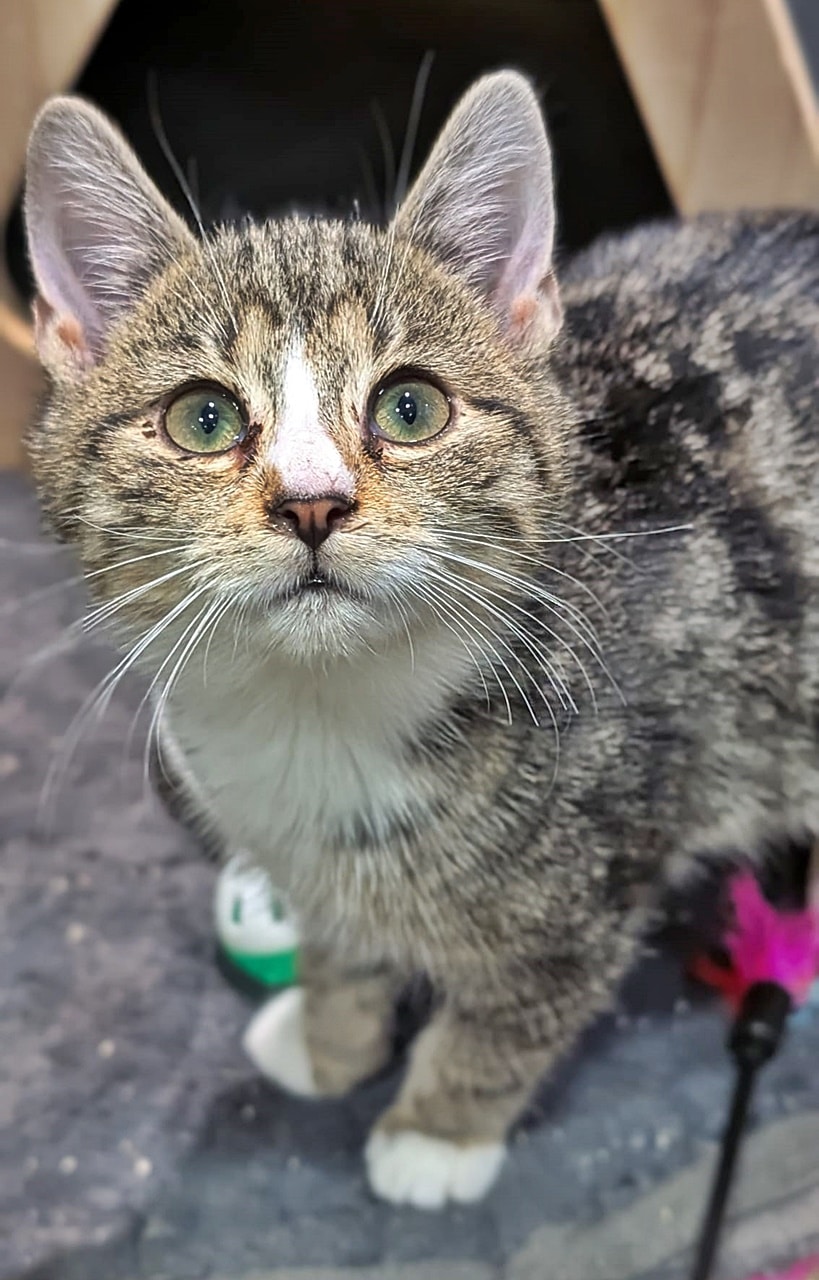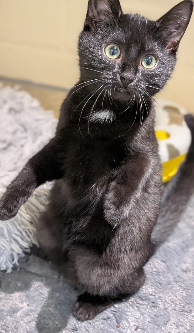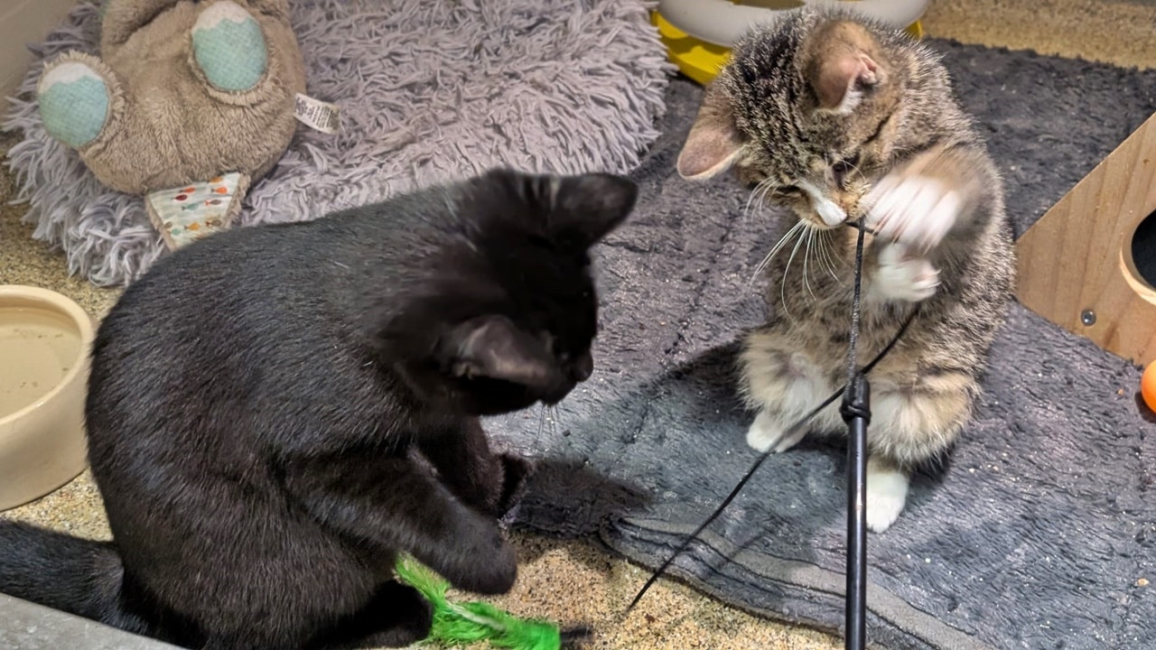 Alfira (schwarz, weiblich) und Wyll (getigert, Kater) kamen innerhalb eines Monats als Kitten in unser Tierheim. Alfira ist etwa 3-4 Wochen älter als Wyll.