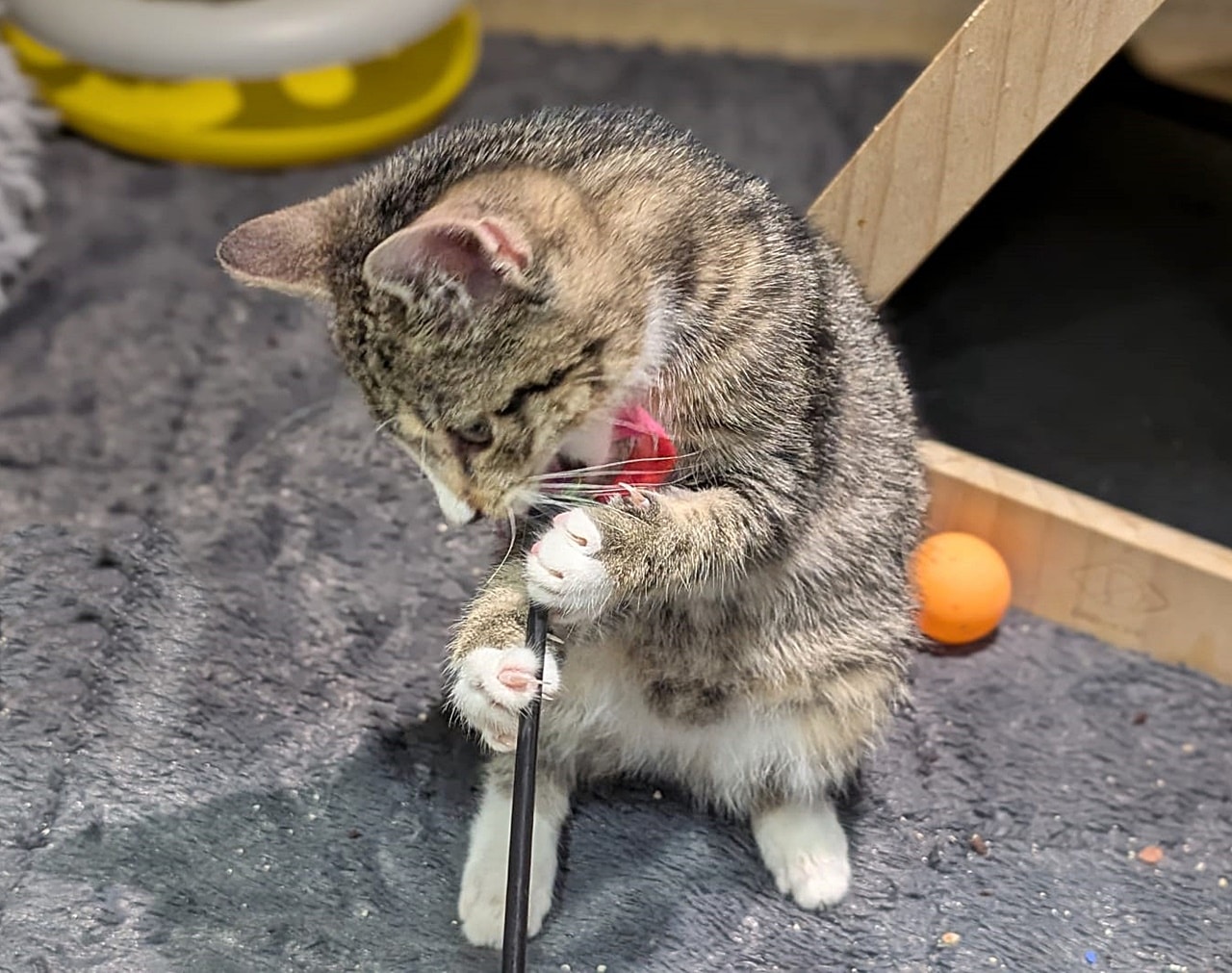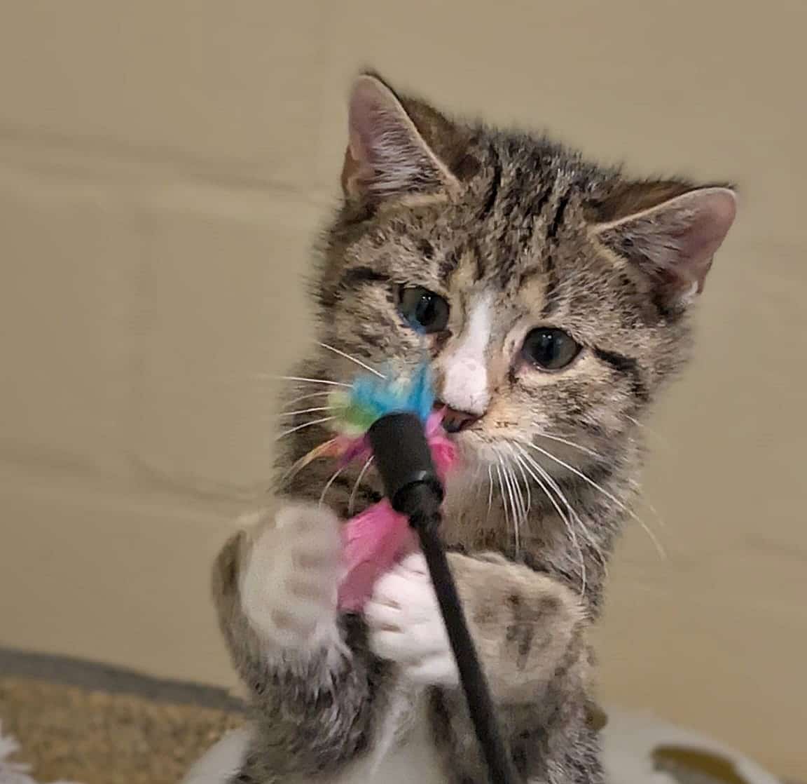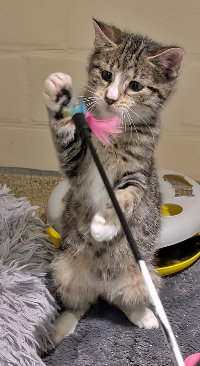 Alfira (schwarz, weiblich) und Wyll (getigert, Kater) kamen innerhalb eines Monats als Kitten in unser Tierheim. Alfira ist etwa 3-4 Wochen älter als Wyll.
