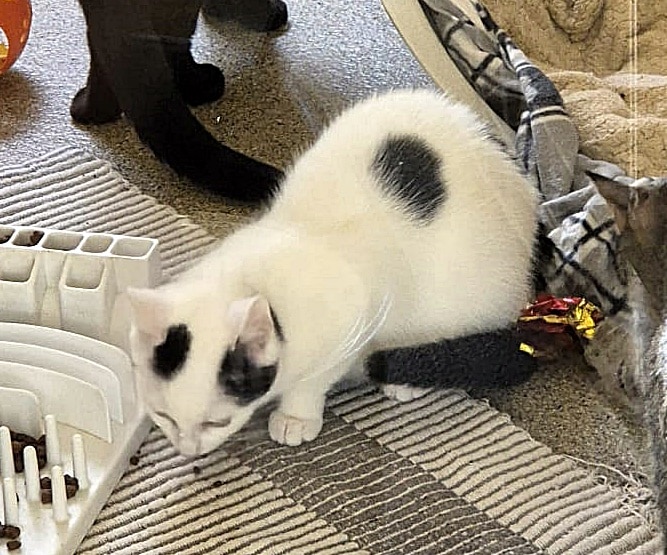 Pünktchen (weiß mit schwarzen Punkten) und Anton (Grautiger mit weiß) haben sich bei uns im Tierheim kennen und lieben gelernt. Sie kuscheln und spielen zusammen und ergänzen sich wunderbar, deshalb möchten wir sie auch gemeinsam vermitteln.
