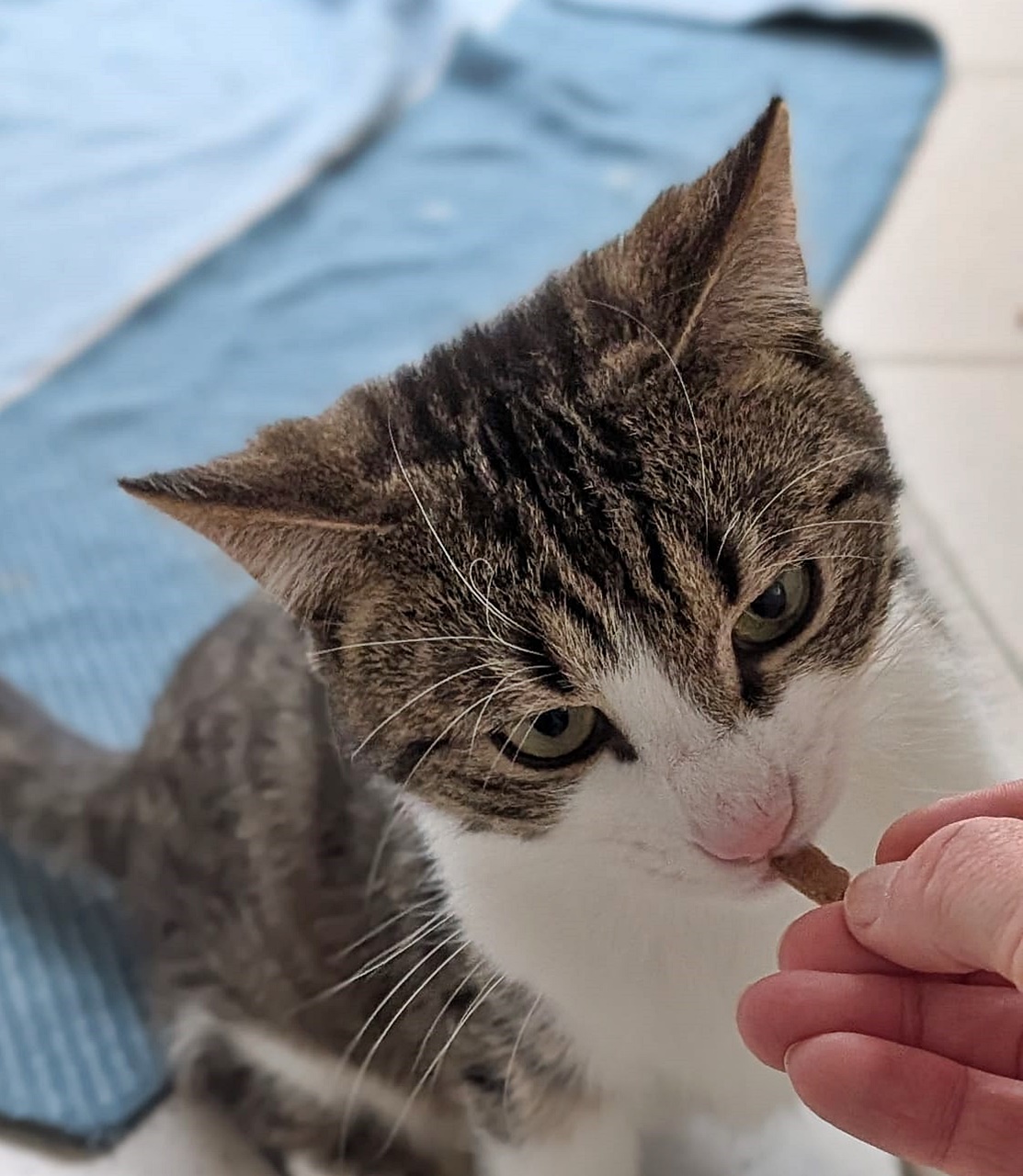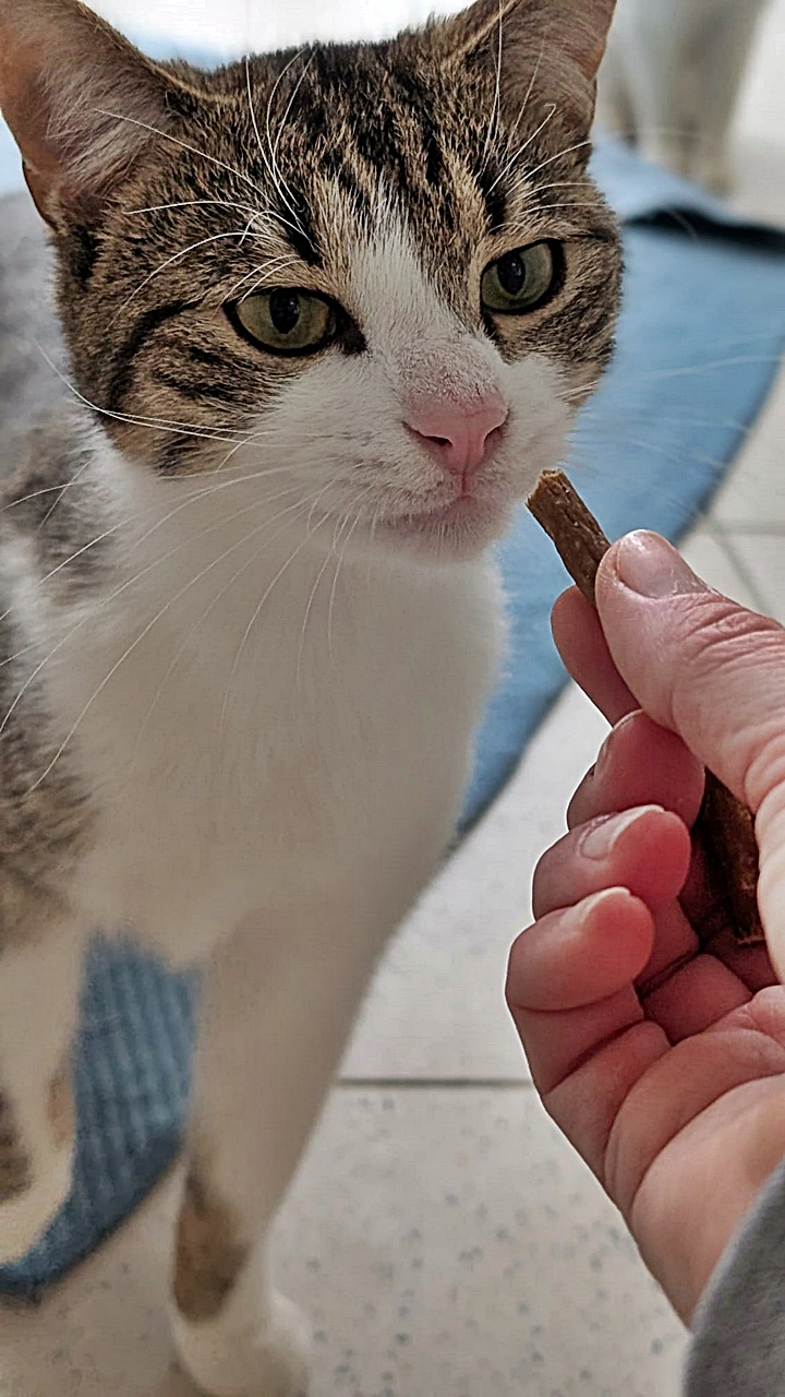 Batsch ist noch schüchtern, er wird Zeit benötigen, um seinen Menschen zu vertrauen. Allerdings: bei unserer Kuschelpatin traut er sich hervor, um Leckerchen anzunehmen; sie kann mit ihm spielen und bei ihr genießt er jetzt die Streicheleinheiten, wie man hier sehen kann :-)