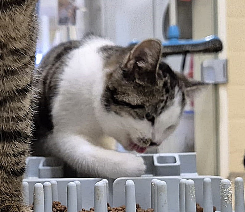 Chicken lebt nun in mit anderen gleichaltrigen Kitten zusammen, mit ihnen tobt und spielt sie gerne, wenn sie nicht gerade mit ihnen kuschelt.