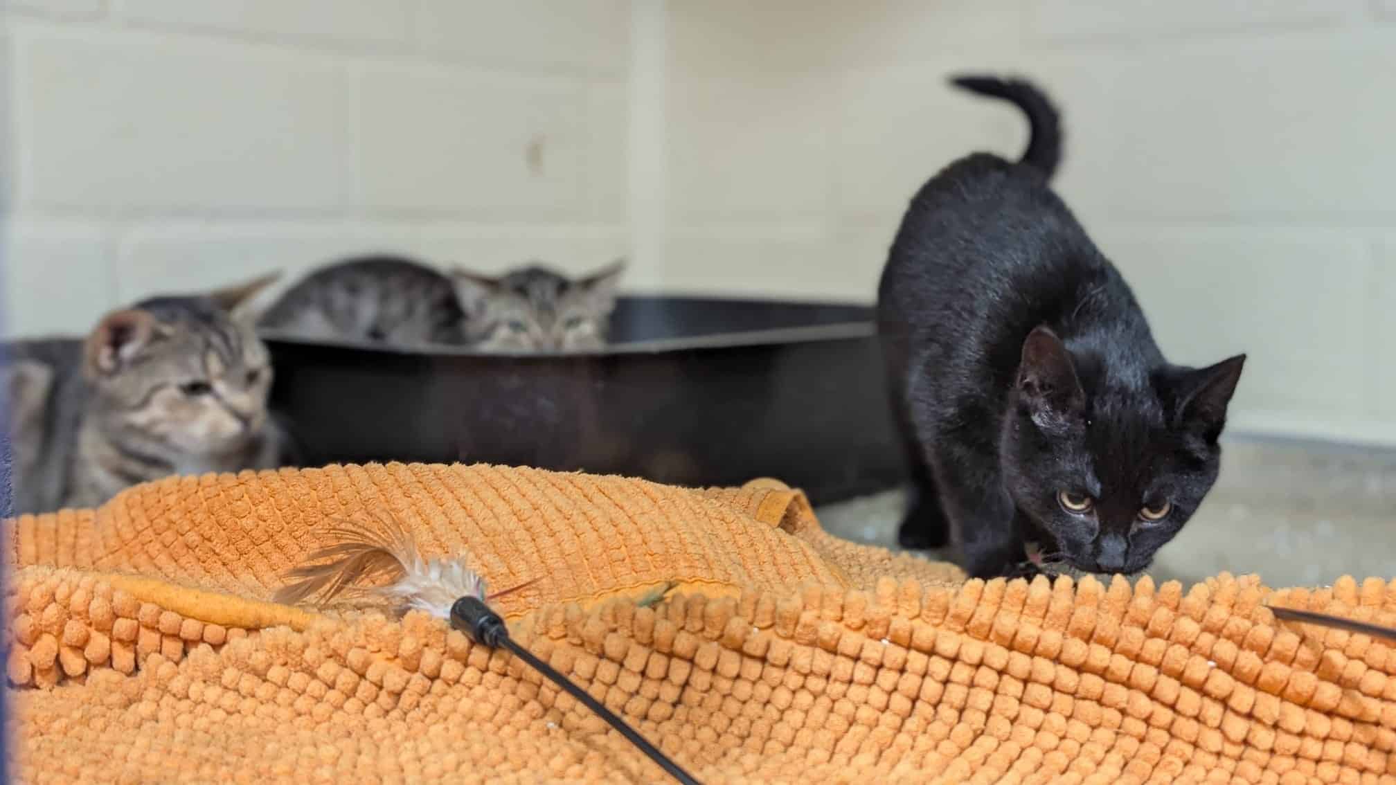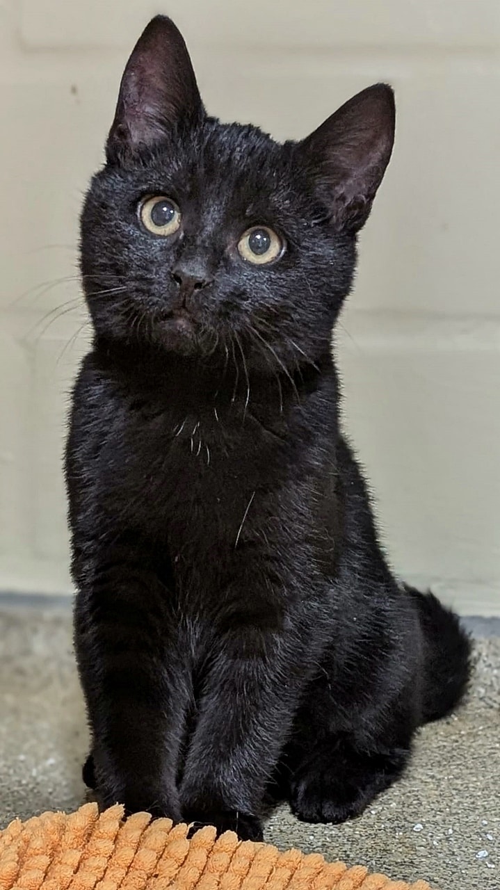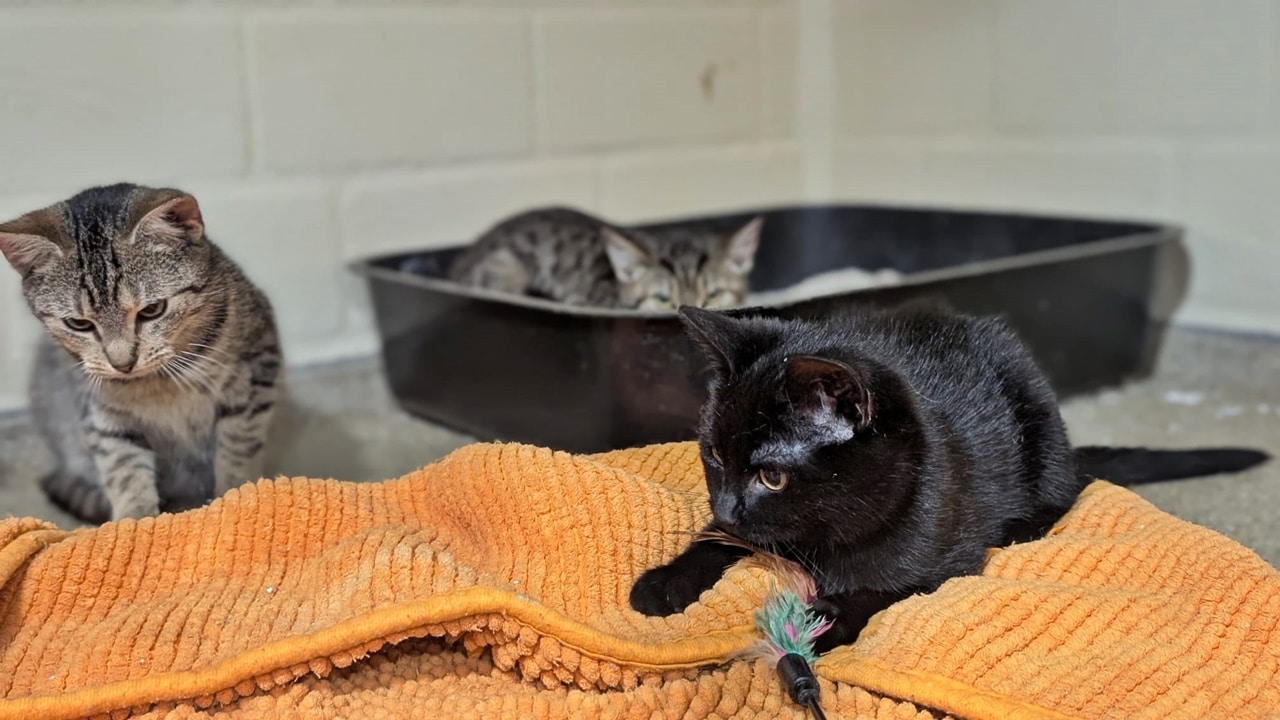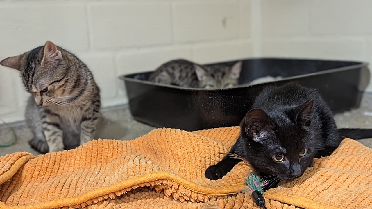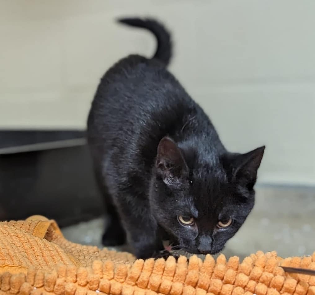 Die kleine Ed kam als Waisenkätzchen in unser Tierheim. Wir haben sie mti Shenzi und Benzai vergesellschaftet, alle drei verstehen sich prima und spielen und kuscheln zusammen.