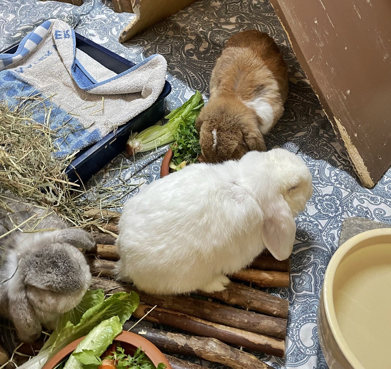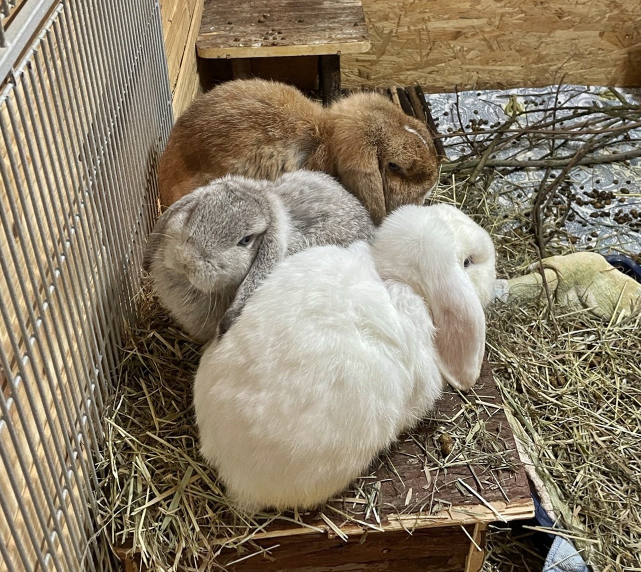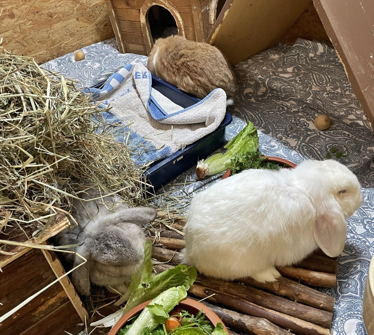 Felix (braun-weiß), Wuschel (weiß) und Bommel (grau-weiß) kamen durch eine Beschlagnahmung in unser Tierheim. Sie mussten ihr Zuhause mit vielen anderen Kaninchen teilen.