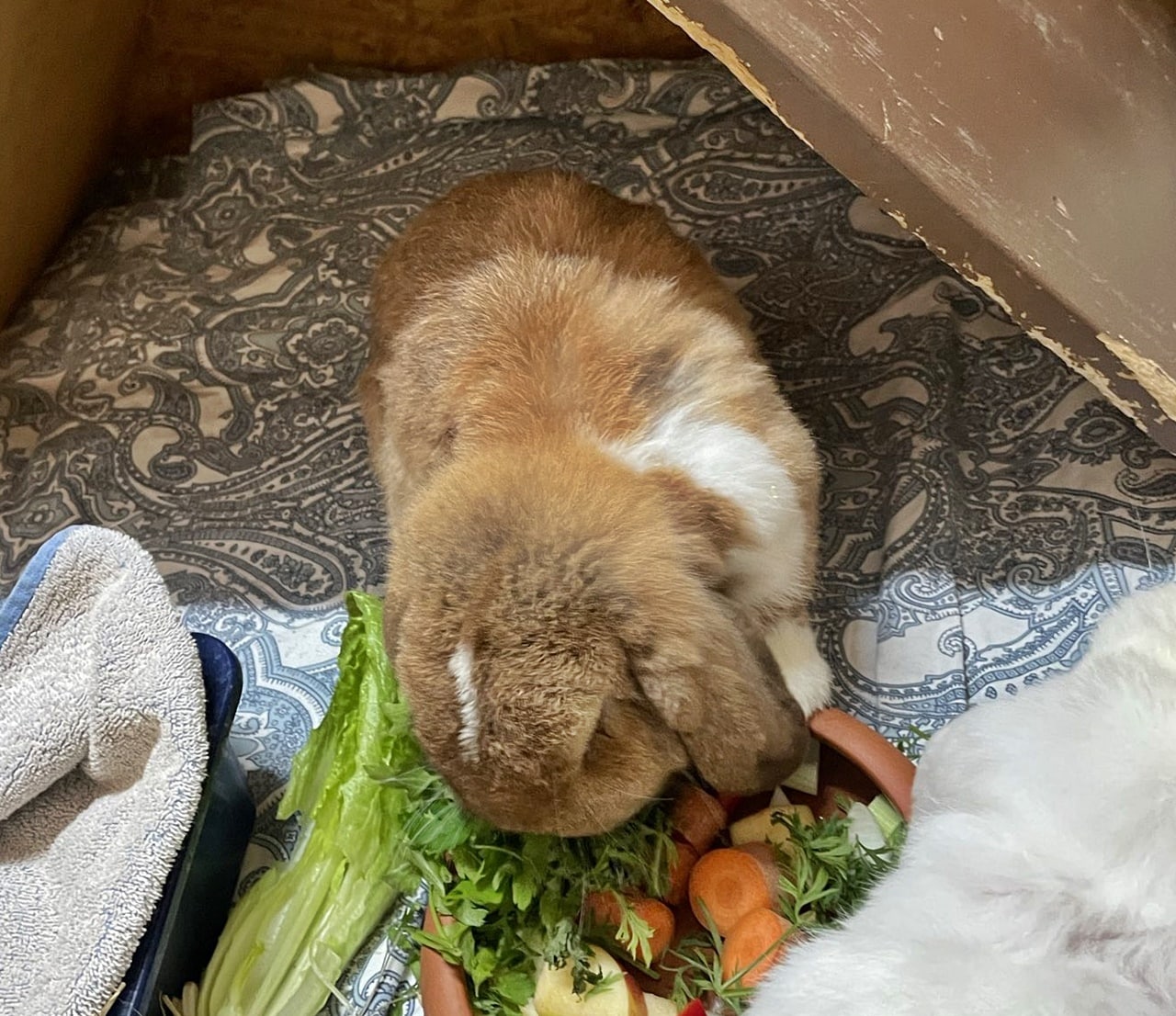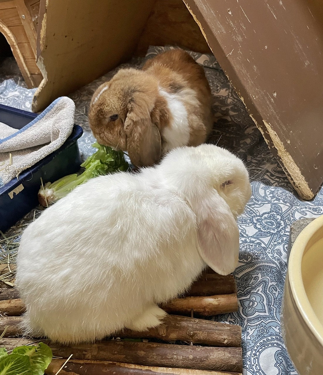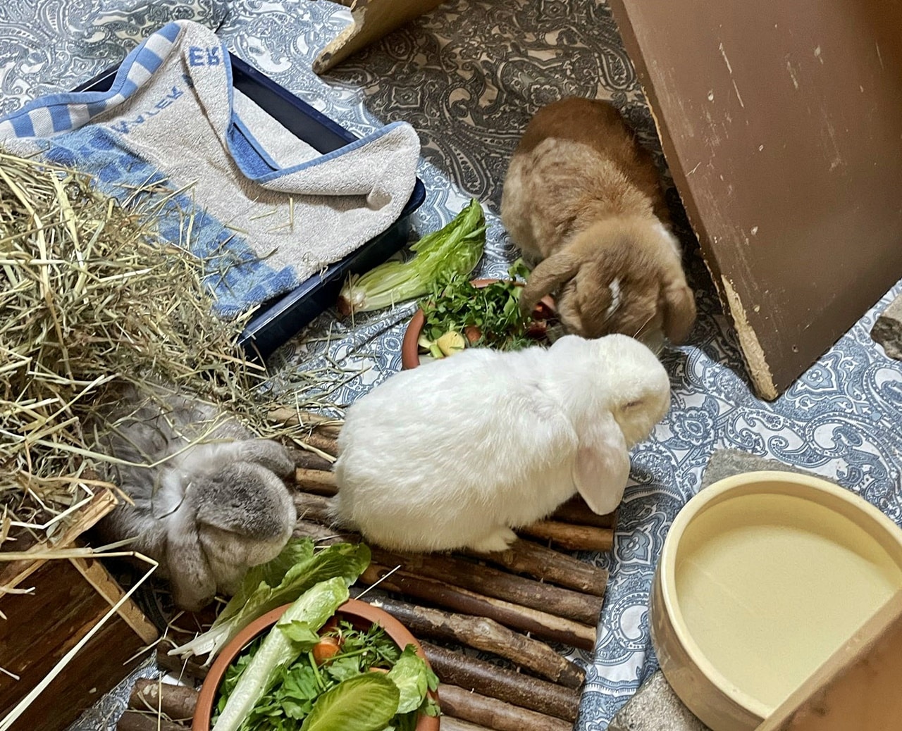 Felix (braun-weiß), Wuschel (weiß) und Bommel (grau-weiß) kamen durch eine Beschlagnahmung in unser Tierheim. Sie mussten ihr Zuhause mit vielen anderen Kaninchen teilen.