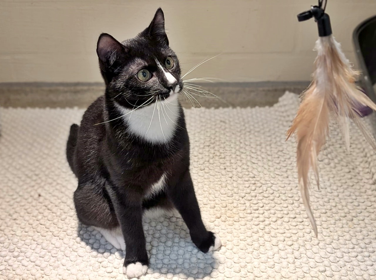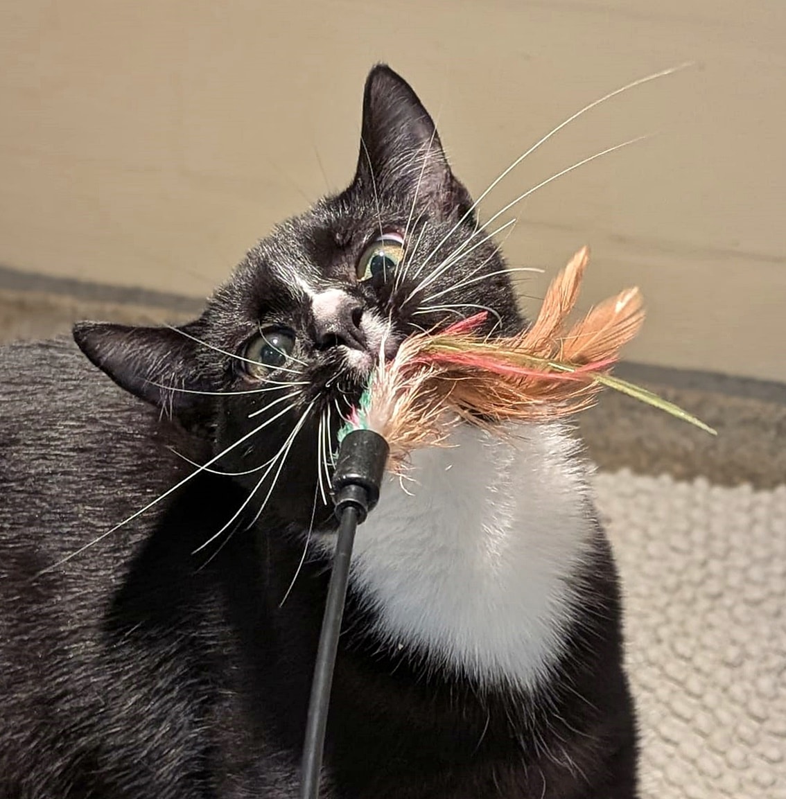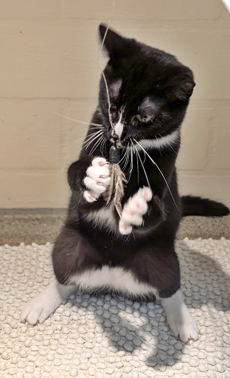 Das Eingesperrtsein behagt unserem Flummi überhaupt nicht, agil wie er ist, hat er einen starken Bewegungsdrang und liebt es zu spielen und zu toben - entweder mit uns Menschen oder mit seinen Katzenfreunden.