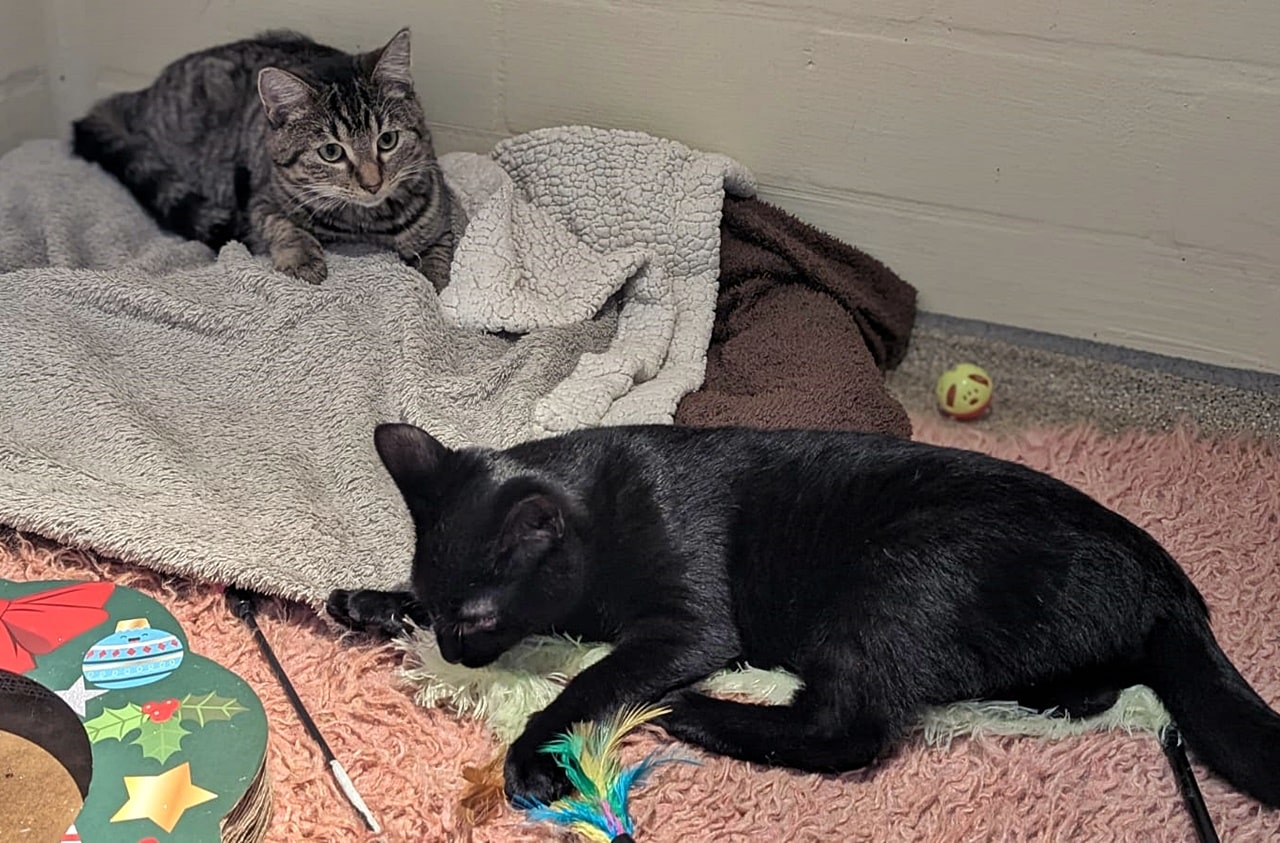 Fred (schwarz) und Valentin (getigert) haben sich bei uns im Tierheim kennen und lieben gelernt. Beide sind fast gleich alt, Valentin kam jedoch schon im Oktober zu uns.