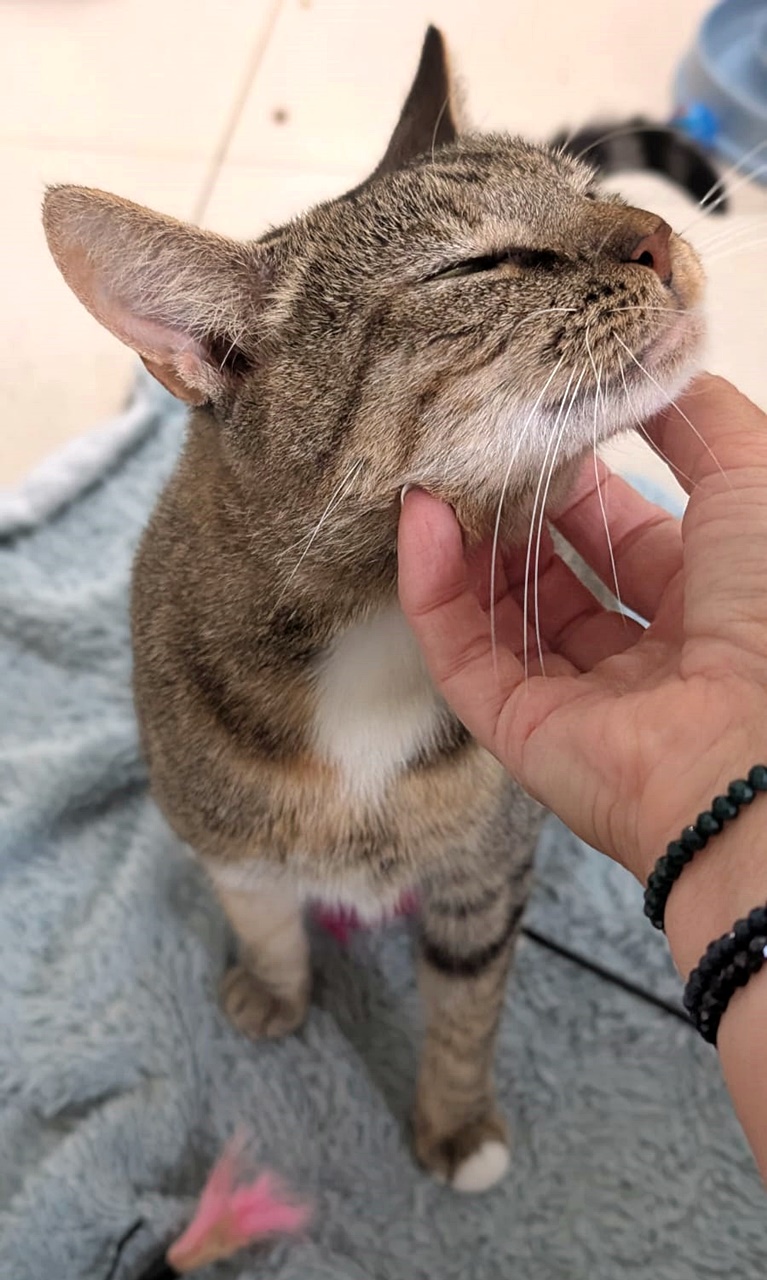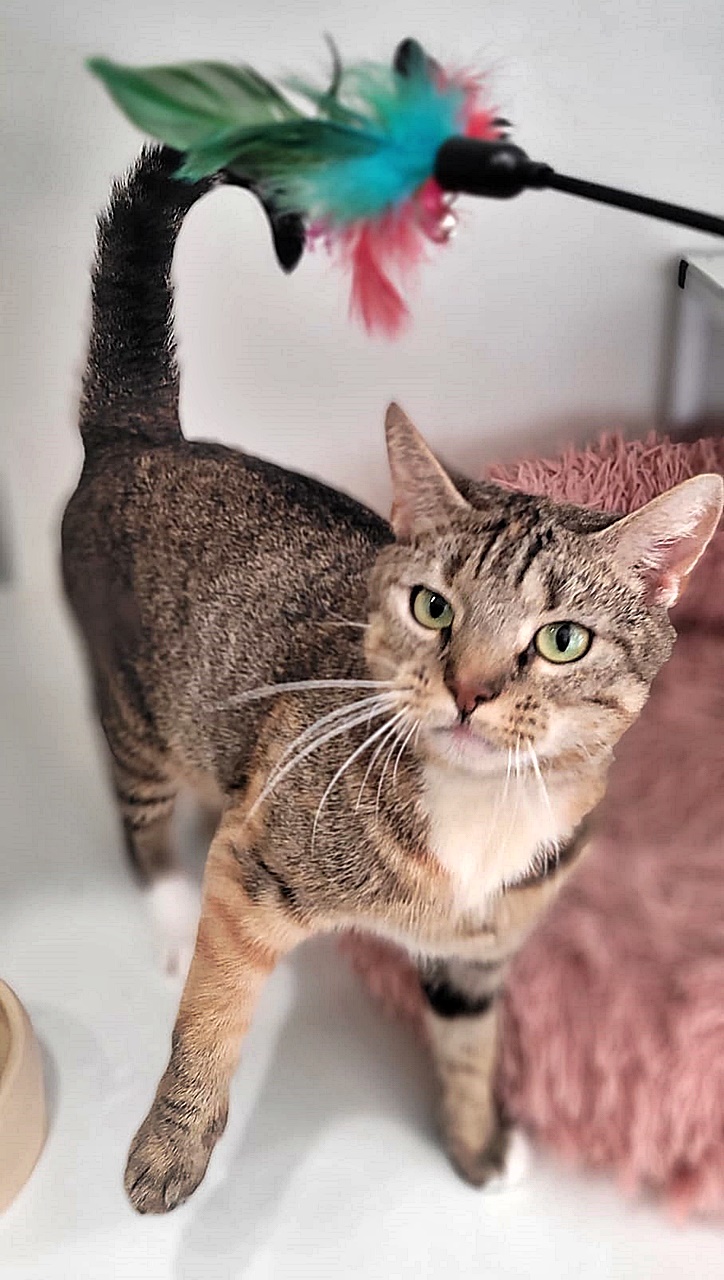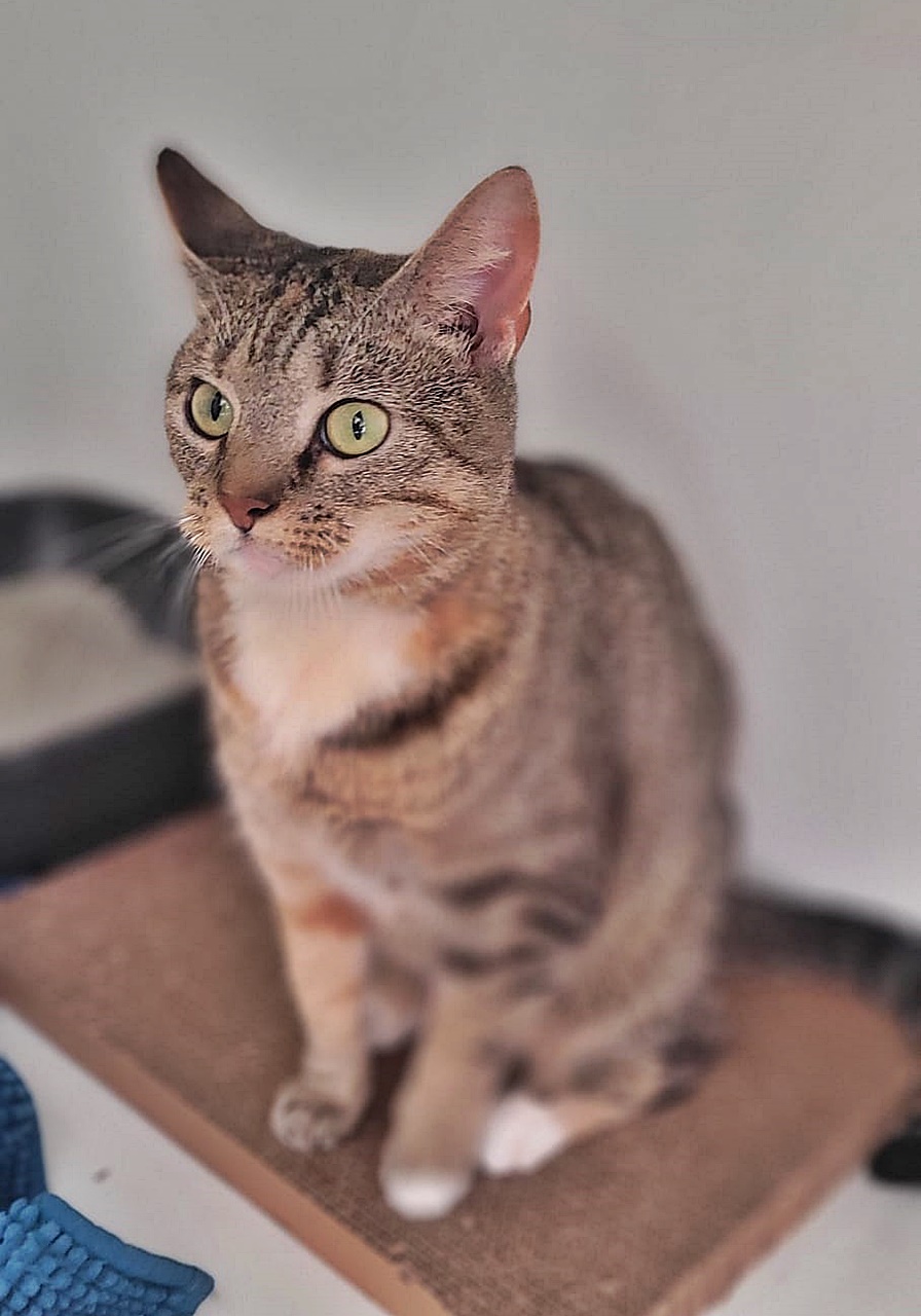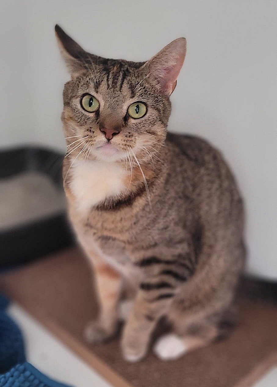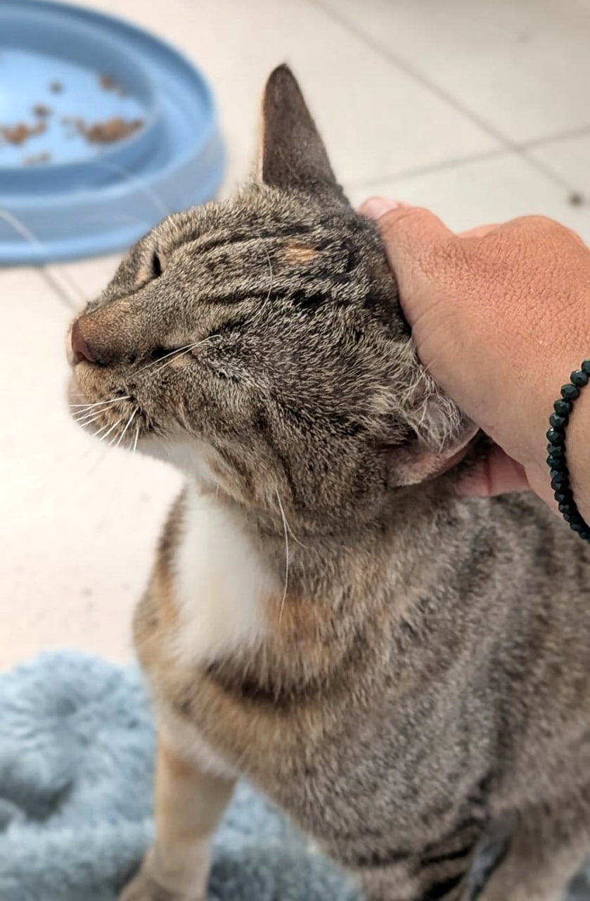 Die sanfte Georgia ist eine schöne Tigerkatze mit leicht rötlichem Einschlag. Sie kam als verletzte Fundkatze zu uns, ihr Halsbereich wies Brand- oder Verätzungswunden auf. Es hat eine Weile gedauert, aber mittlerweile ist Georgia wieder zur vollen Schönheit aufgeblüht.