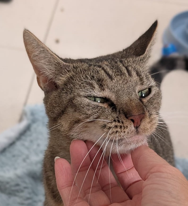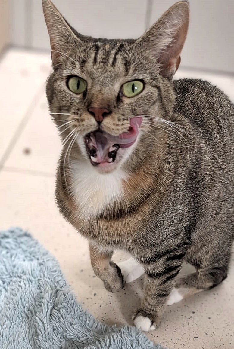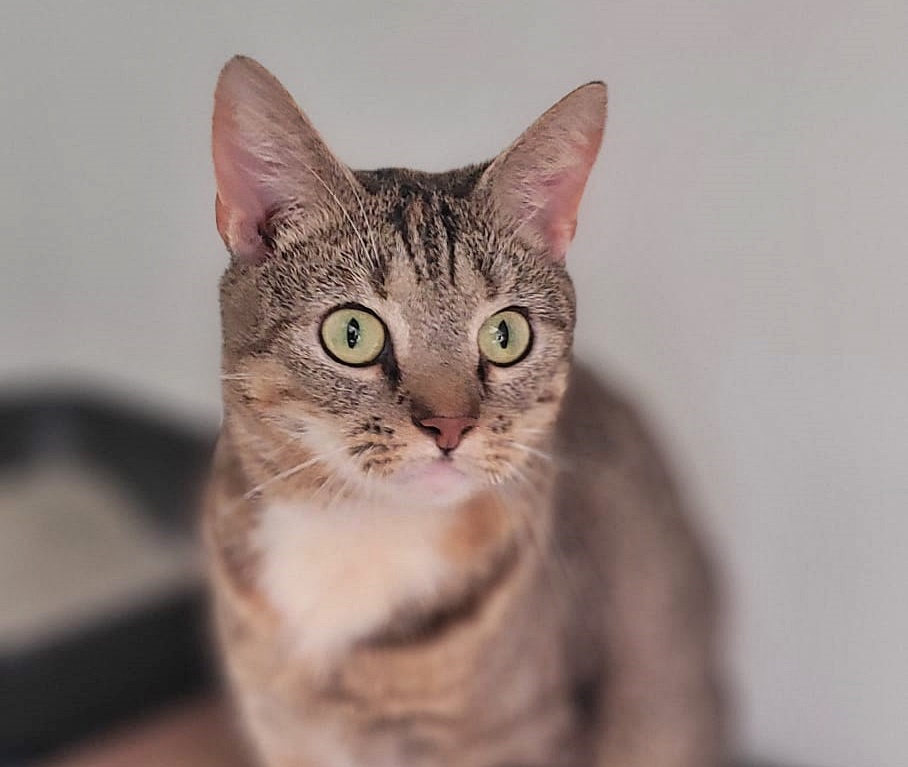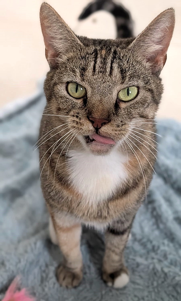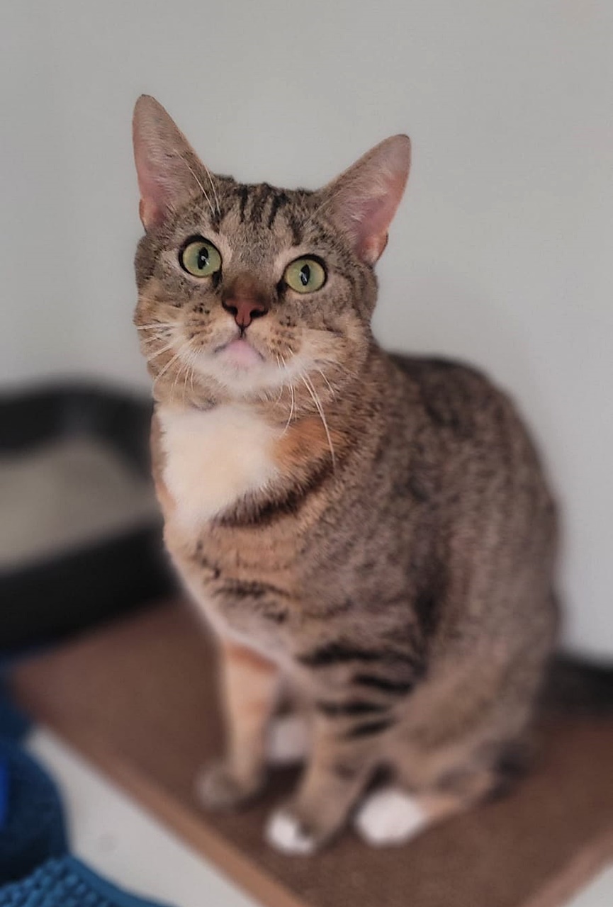 Die sanfte Georgia ist eine schöne Tigerkatze mit leicht rötlichem Einschlag. Sie kam als verletzte Fundkatze zu uns, ihr Halsbereich wies Brand- oder Verätzungswunden auf. Es hat eine Weile gedauert, aber mittlerweile ist Georgia wieder zur vollen Schönheit aufgeblüht.