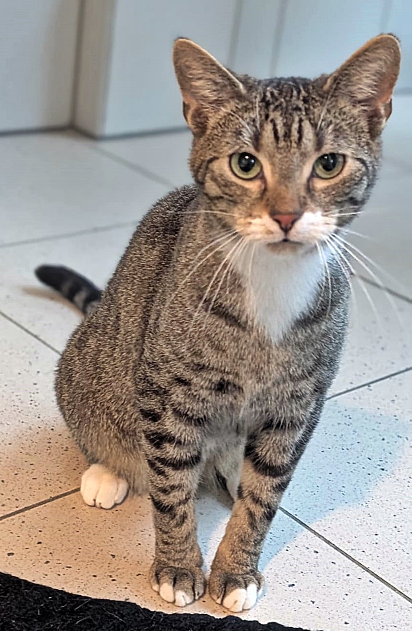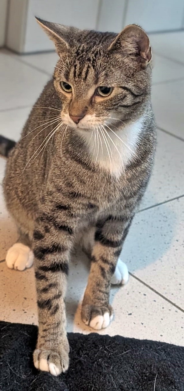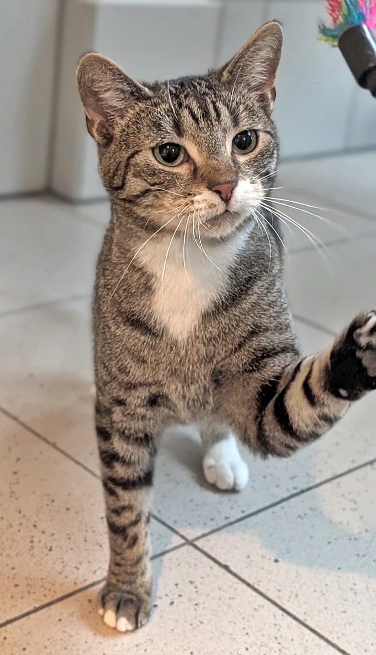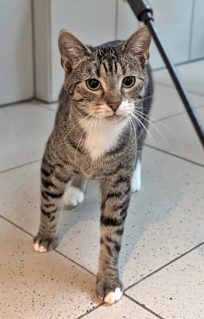 Gisbert ist ein getigerter Kater mit weißen Abzeichen, der als kleines Kitten ohne seine Mutter gefunden wurde. Gisbert ist Zweibeinern gegenüber immer noch sehr vorsichtig. Allerdins liebt er es mittlerweile, mit seiner Kuschelpatin zu spielen und lässt sich von ihr auch schon kurz das Fell streicheln :-)