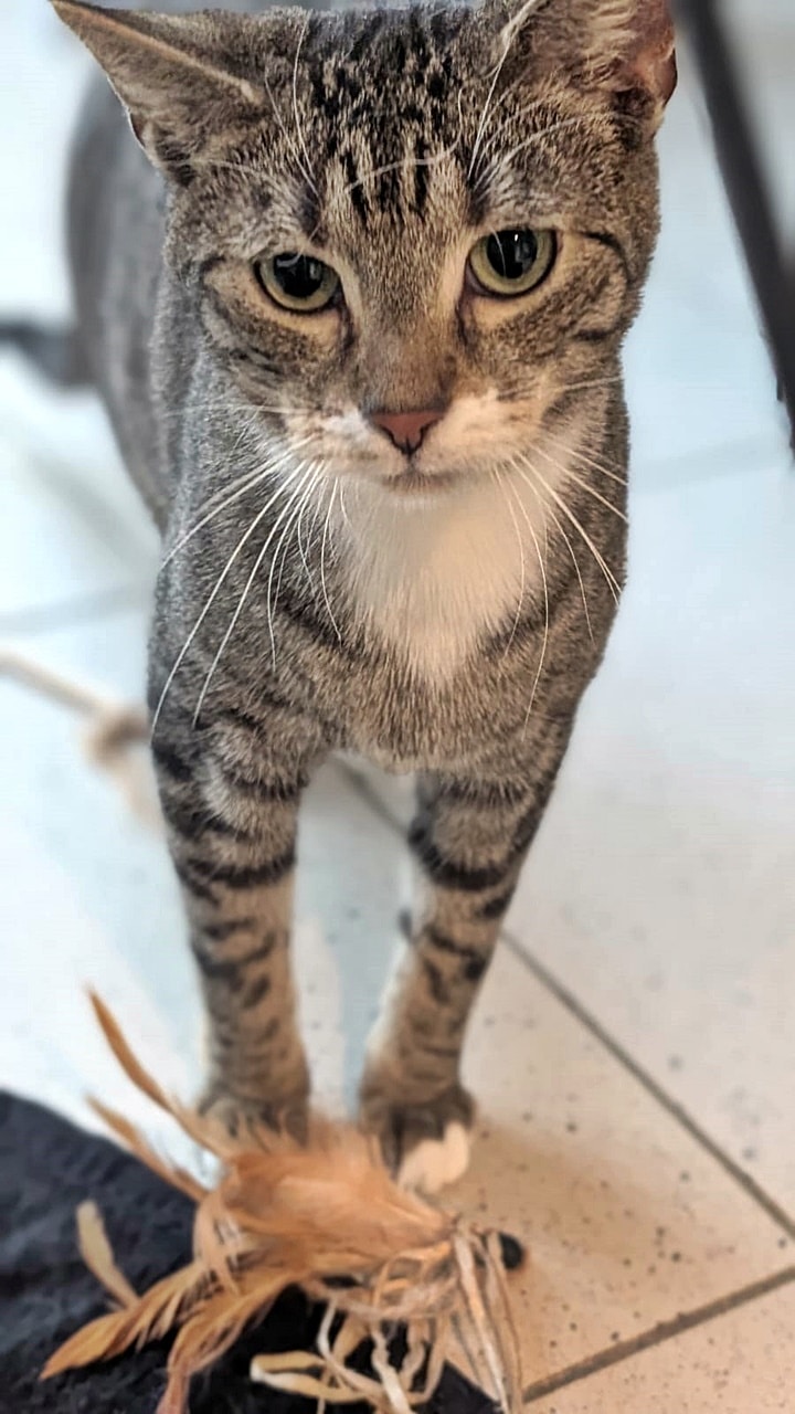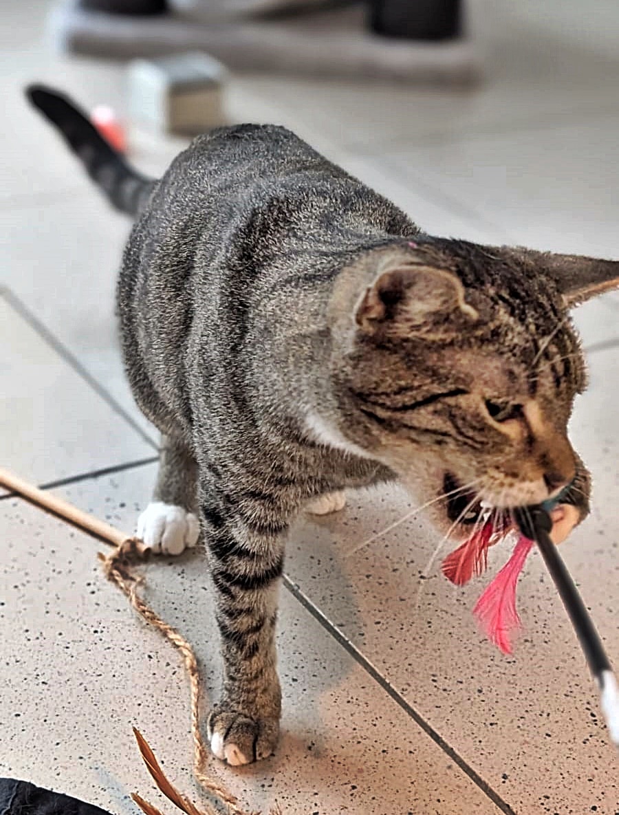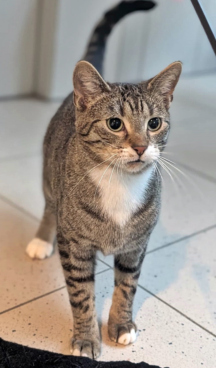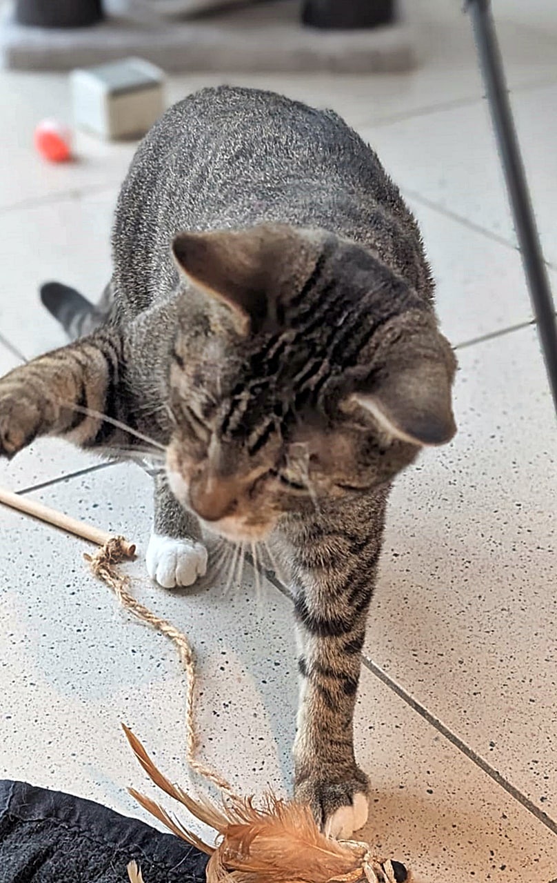 Gisbert ist ein getigerter Kater mit weißen Abzeichen, der als kleines Kitten ohne seine Mutter gefunden wurde. Gisbert ist Zweibeinern gegenüber immer noch sehr vorsichtig. Allerdins liebt er es mittlerweile, mit seiner Kuschelpatin zu spielen und lässt sich von ihr auch schon kurz das Fell streicheln :-)