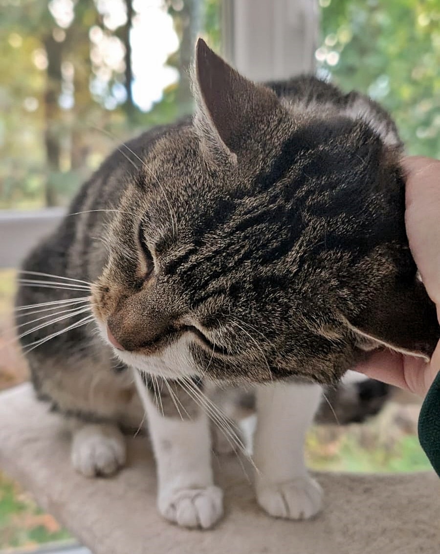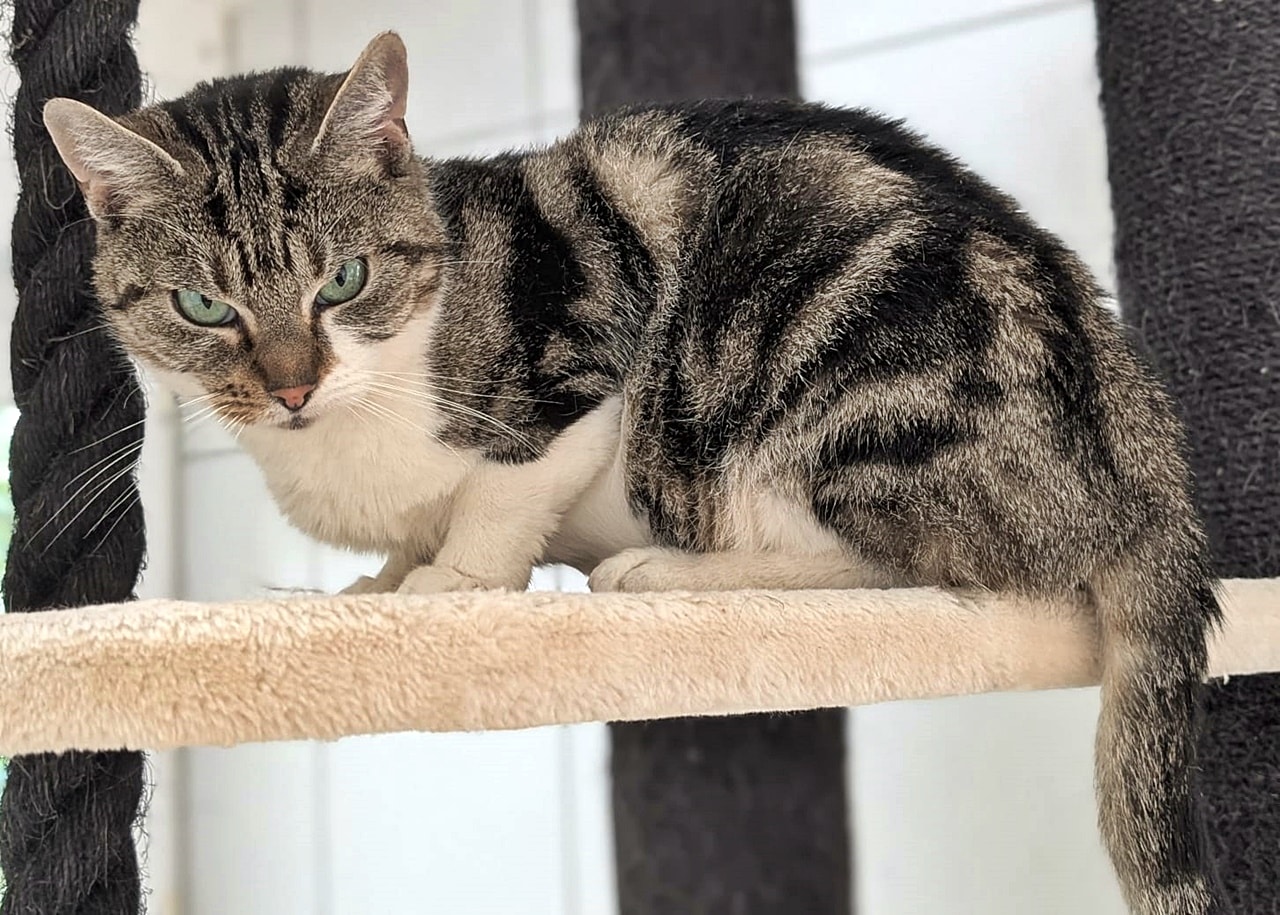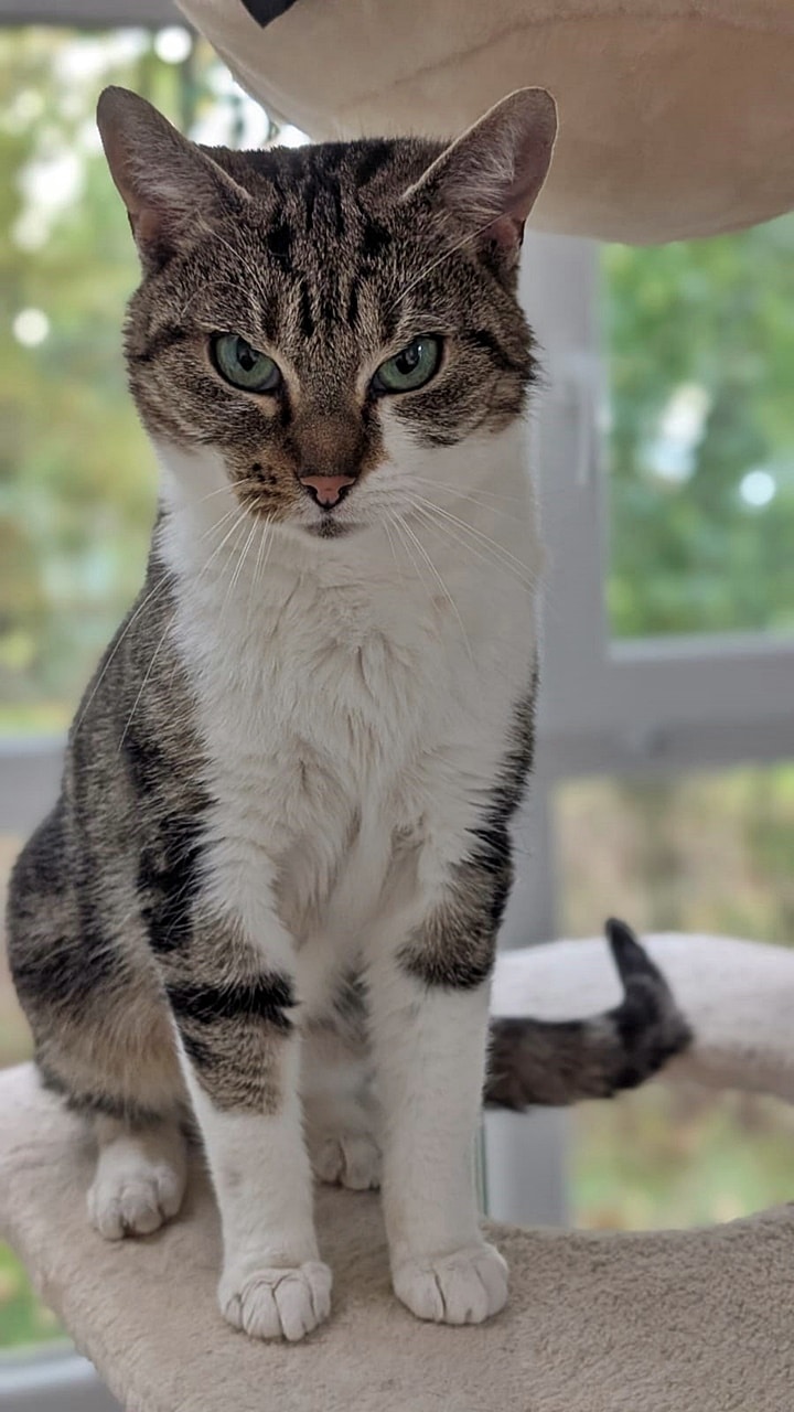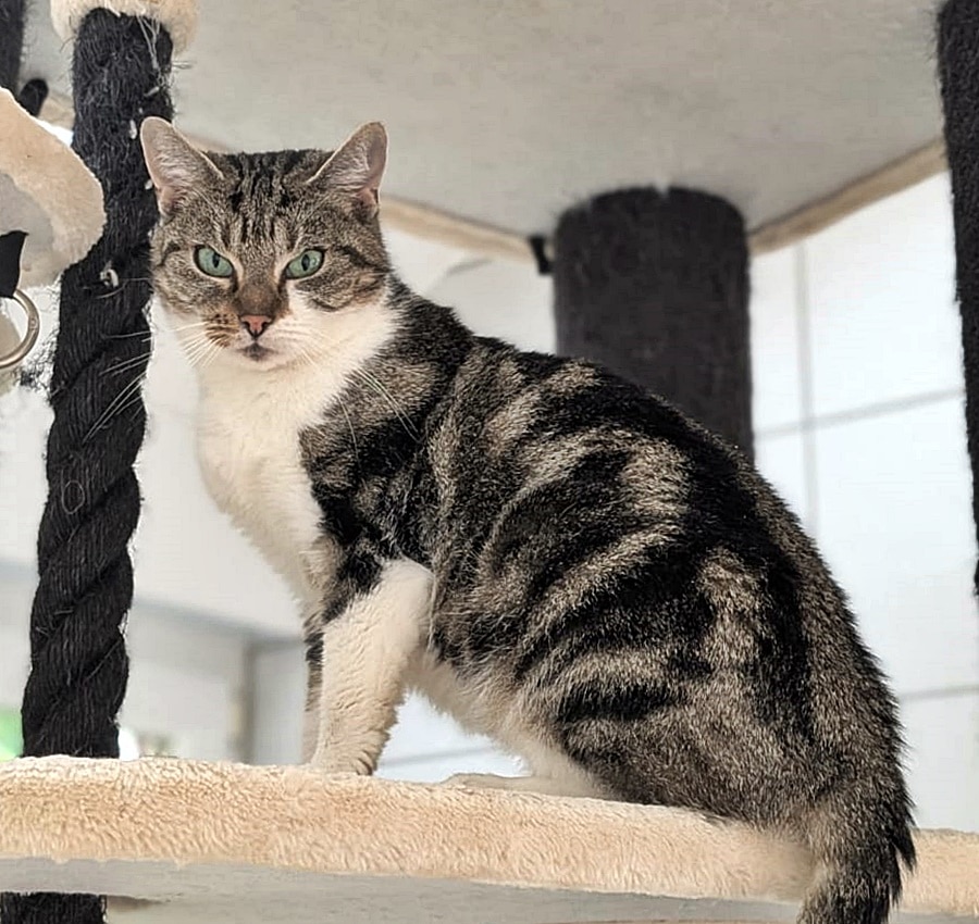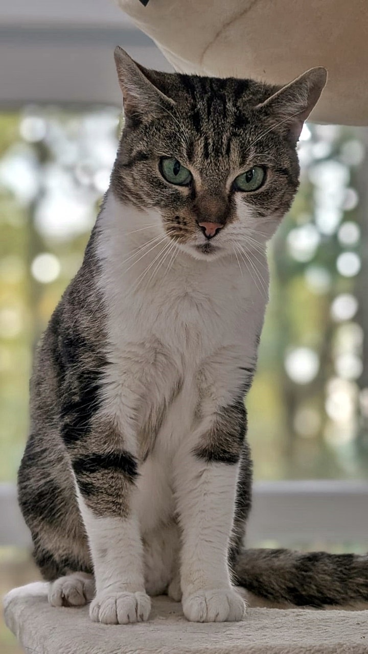 Kosmo hat strahlend grüne starrende Augen, die ihre Besucher zu durchdringen scheinen, nach dem Motto: komm und streichle mich! Alle Pflegerinnen sind fasziniert von ihr.