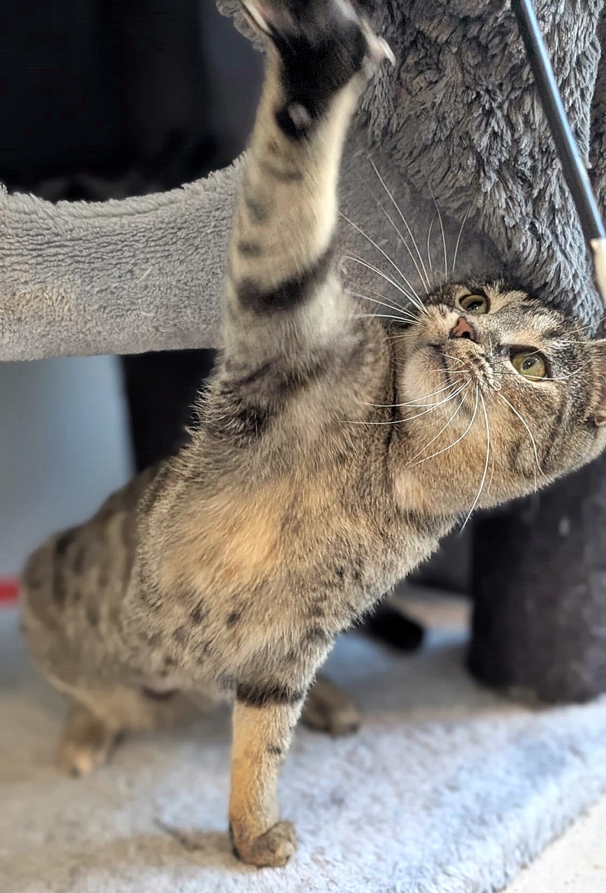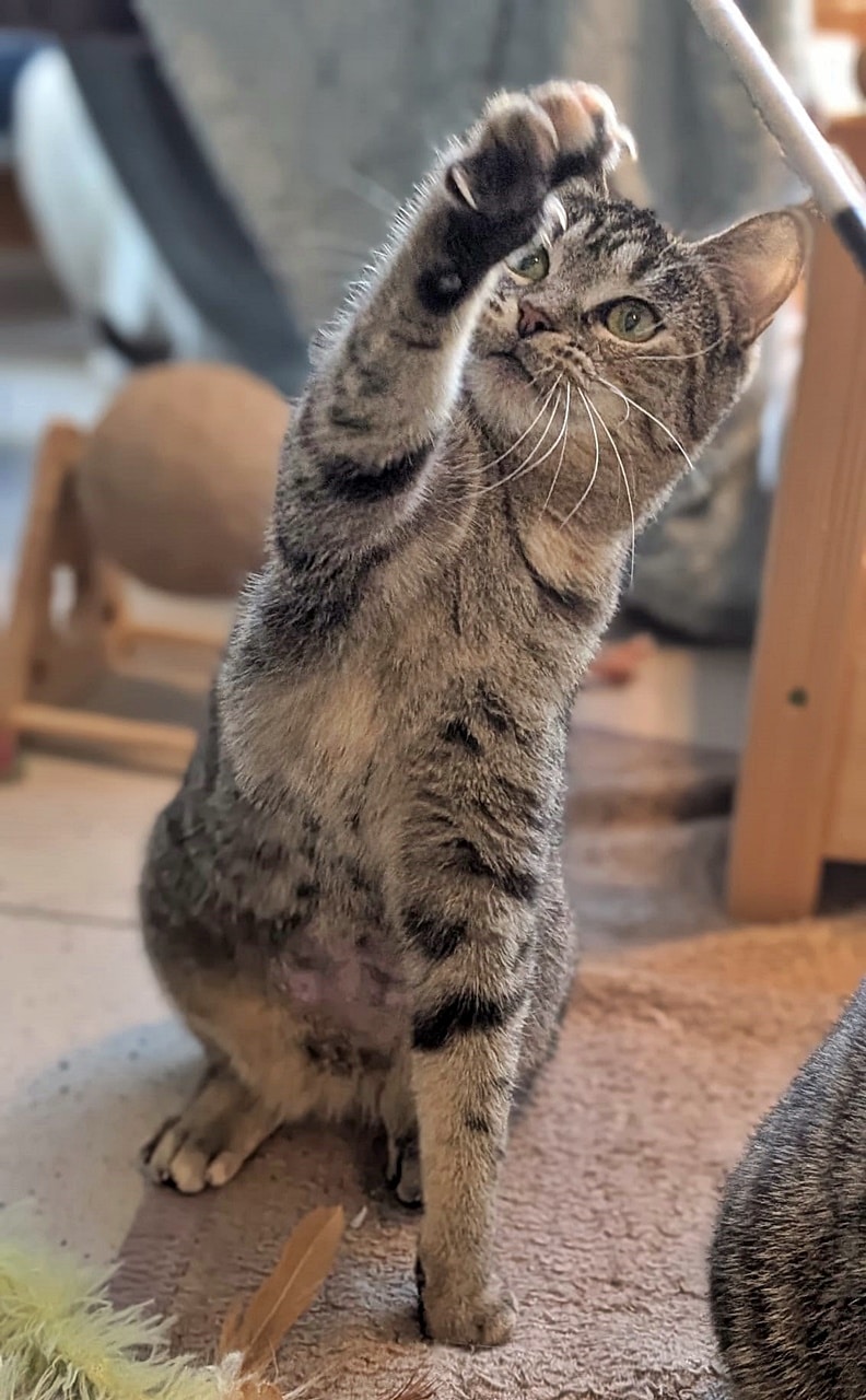 Simea zeigt sich bei uns sehr neugierig, aufmerksa und verspielt. Sie tobt und kuschelt mit ihren Artgenossen uns ist auch einem Angelspiel mit ihrer Kuschelpatin nicht abgeneigt.
