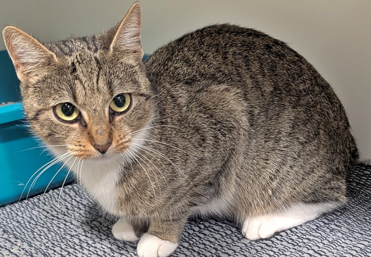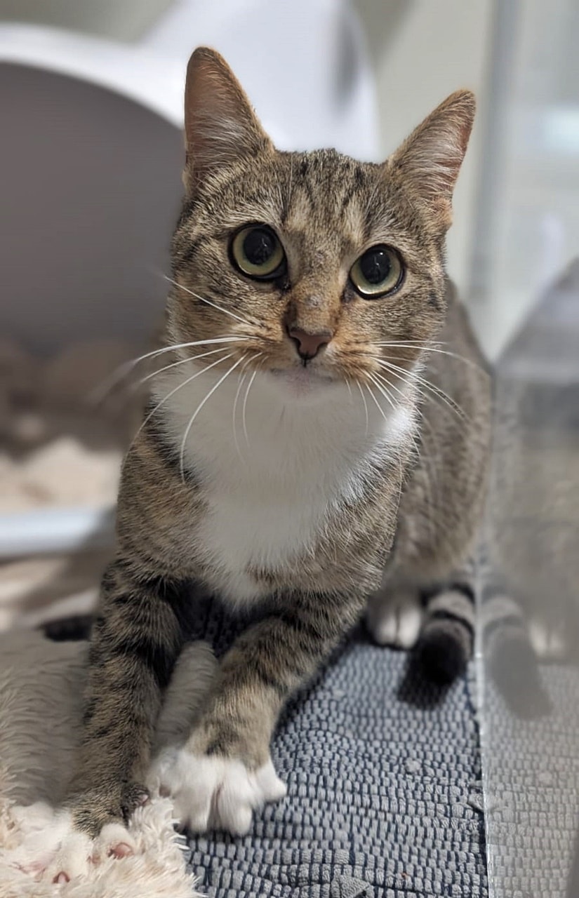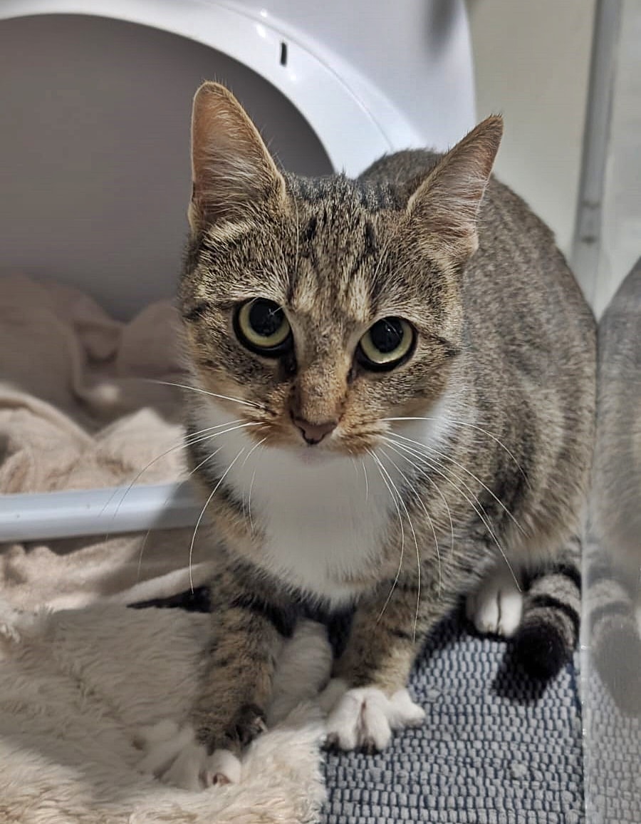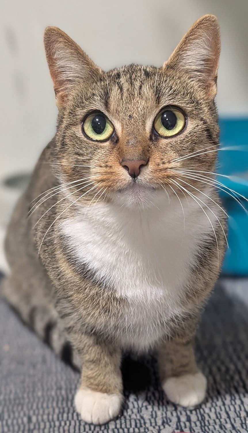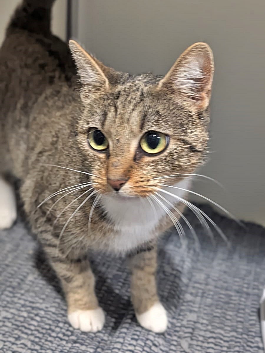 Kiwi ist eine super niedliche Tigerkatze mit rötlichem Einschlag. Besonders ihr bezauberndes Schnütken fällt Besuchern sofort aus.