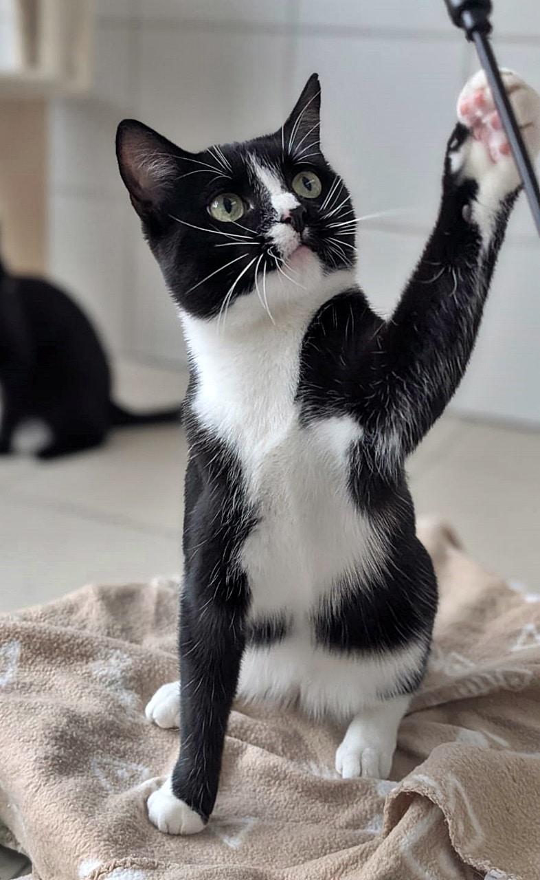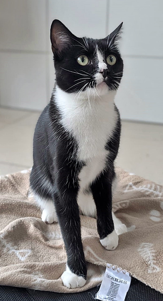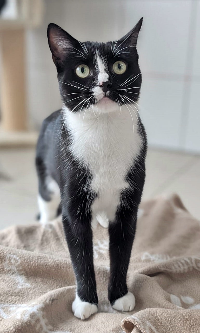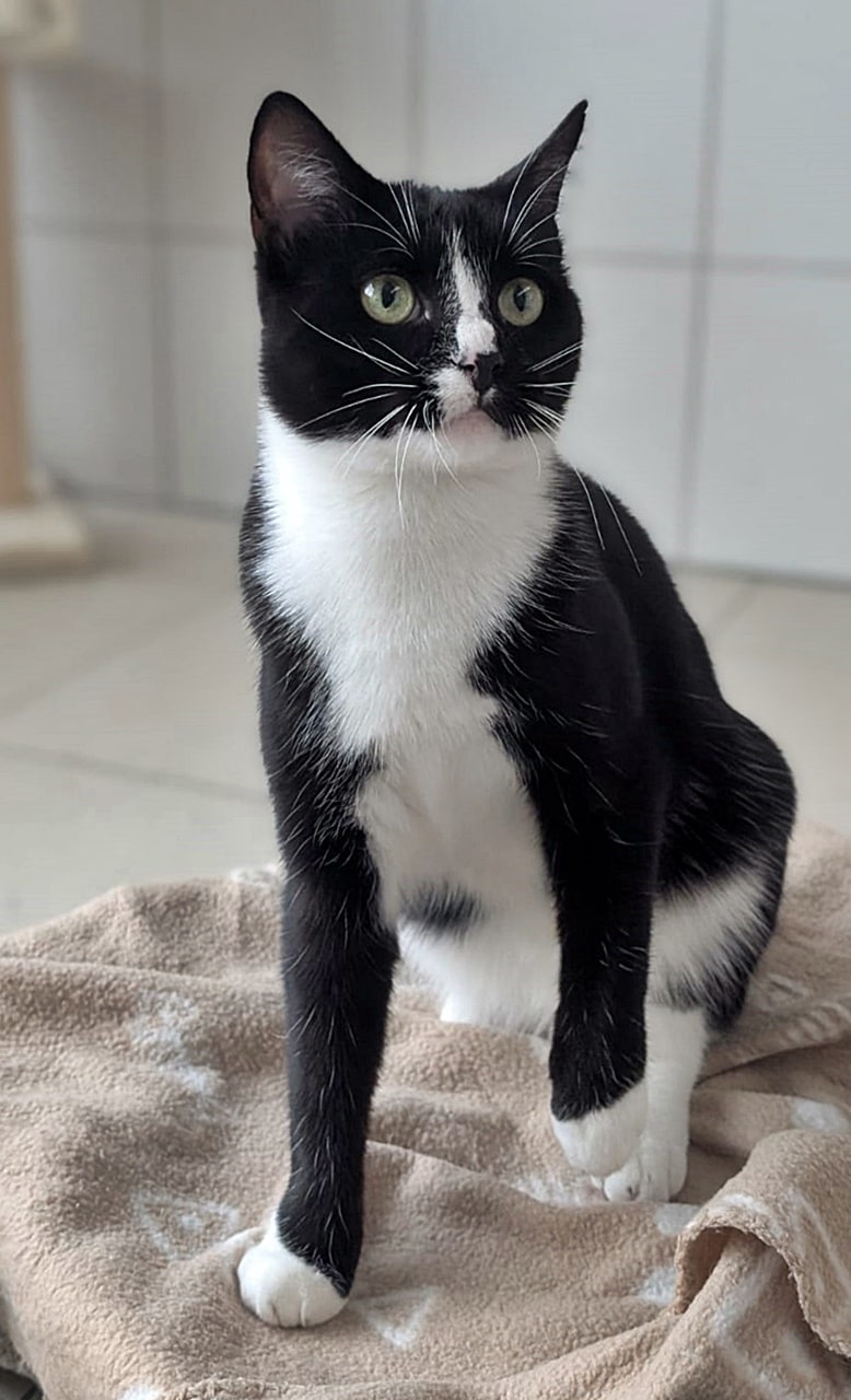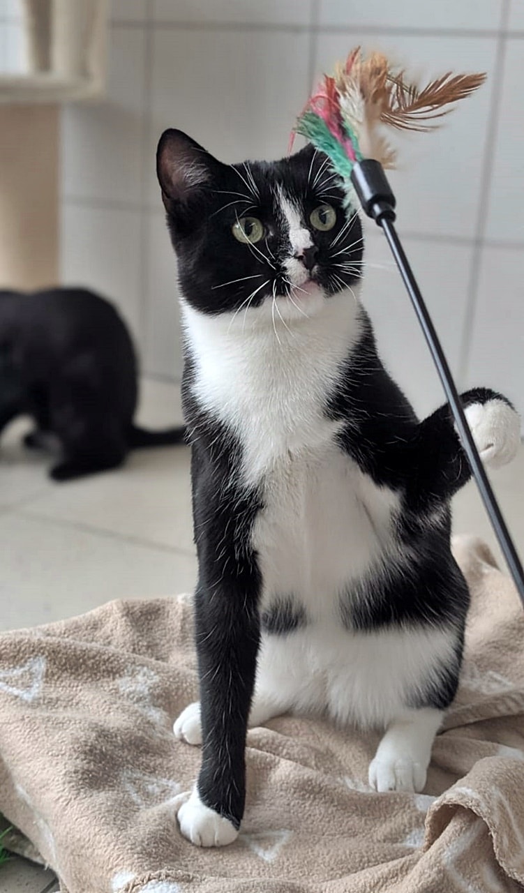 Der schöne Shadow macht seinem Namen alle Ehre: er war der schüchternste und zurückhaltenste aus seiner Vierergruppe, obwohl er so ein hübscher Kater ist. Noch immer traut er sich nicht nach vorne, wenn Besucher seinen Raum betreten, und auch beim Spielen mit seinen Artgenossen ist es ihm manchmal zu wild. Aber seiner Kuschelpatin gegenüber zeigt er sich bereits aufgeschlossen und neugierig, hier hat er seine Scheu schon größtenteils abgelegt.